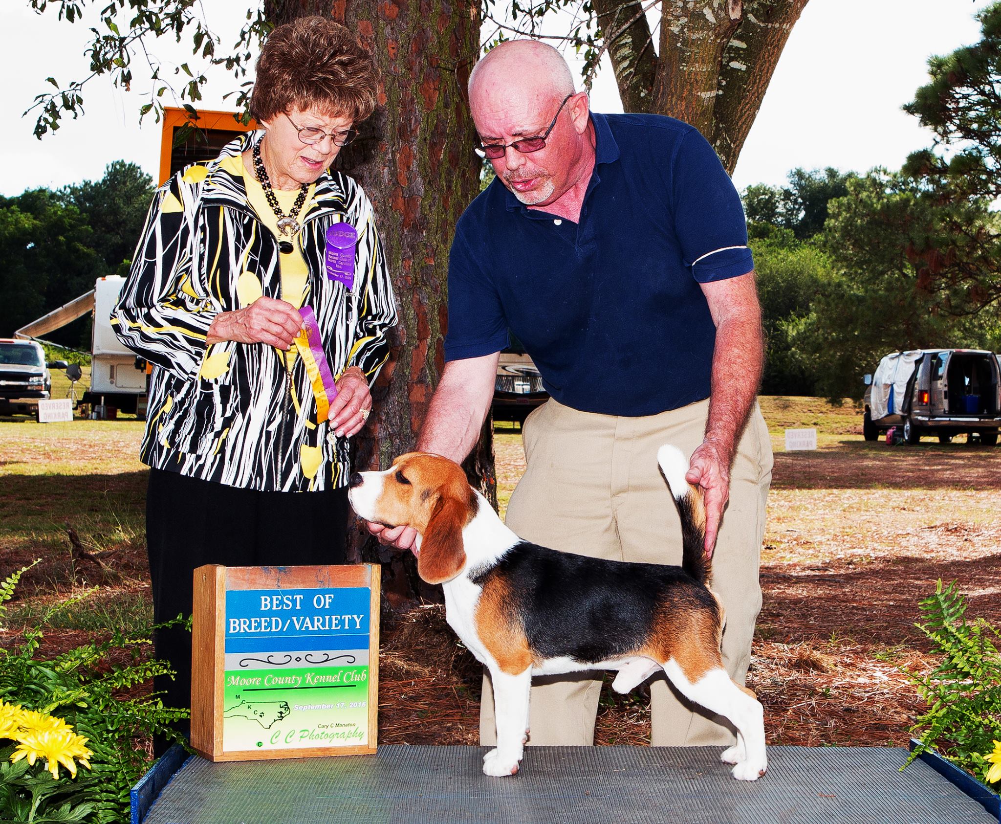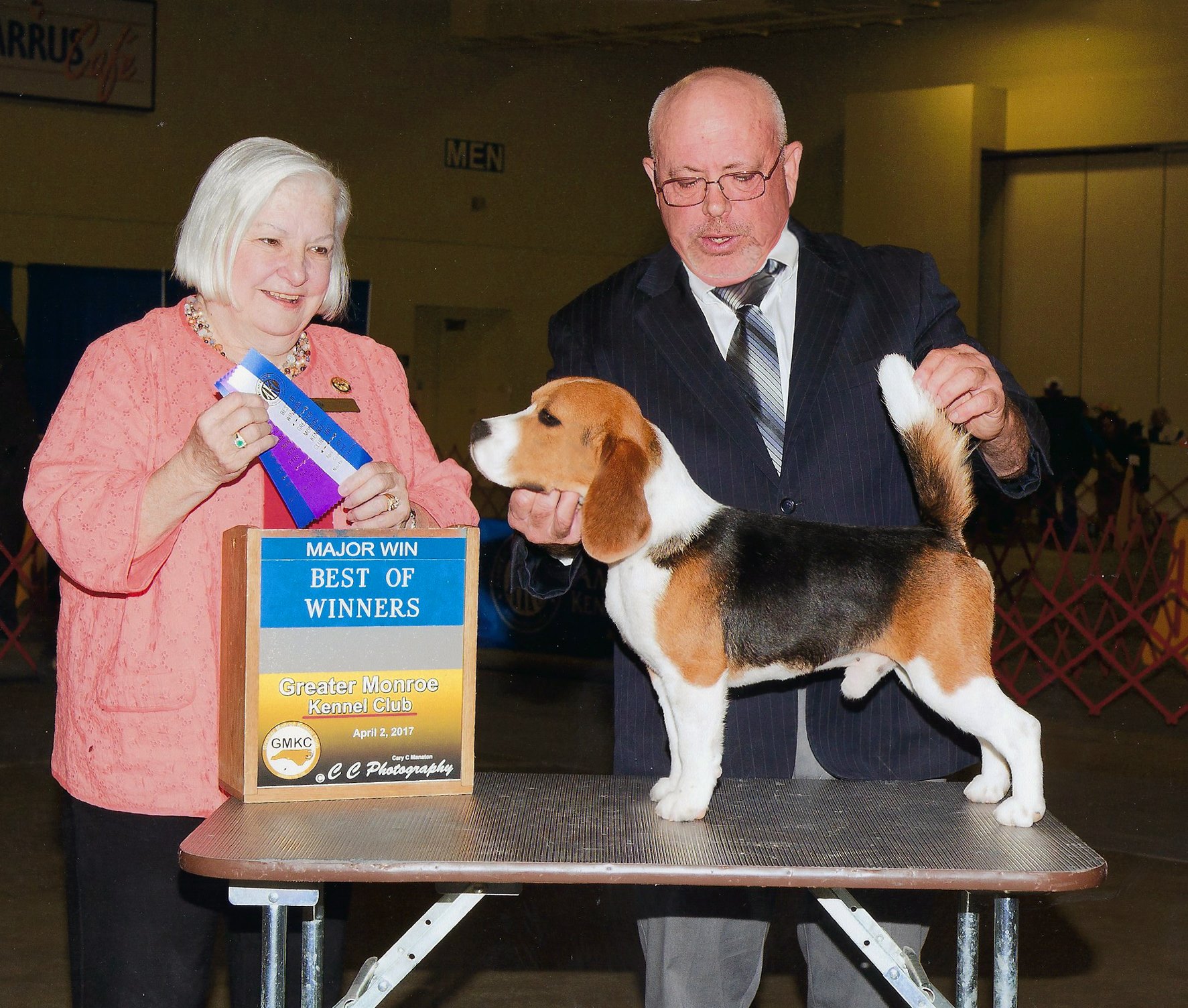 As a puppy, he was awarded Best in Sweepstakes at the National Beagle Club in Portland under Barbara Keenan. He also earned a Best of Variety at the National Beagle Club under Skip Herendeen (possibly Best of Opposite, to be confirmed). In addition, Carson was named Best Stud Dog in Show at the National Beagle Club likely two, and possibly three, times.