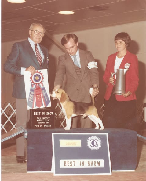 Pictured is me handling Dickens to his first Best in Show. This was a special moment for me. He went on to win 13 Best in Shows and earned several placements at Westminster, including multiple Variety wins along with a Group 3rd and 4th (and possibly a Group 2nd). He was also Best of Breed at the National Beagle Club.
